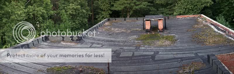 Вышли, пошли в 4-х этажное здание (вроде пионерлагеря не выше 2-х?), внутри темно, почти все окна целы, почти все наружние двери закрыты. Планировка чисто совково домотдыховская - один санузел на два номера. коридор -слевасправа номера. Пол застлан какими то мягкими полосками, на стенках плитка. но в номерах стены непокрашены. Как будто закончили на 90% и послали нафик.. изнутри фот почти нет, ибо темно